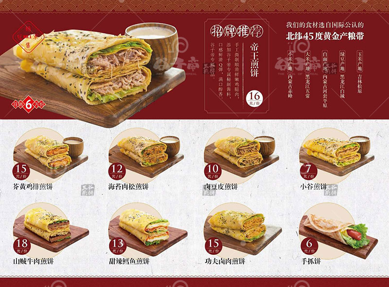 谷子帝依托專業化的產品研發,獨具一格的膳食結構,傾心打造國際煎餅連鎖品牌。谷子帝將攜手天下有志之士,濟世立業、創富社會,讓五谷煎餅代表中國味道走向世界,讓谷子帝品牌暢響全球!